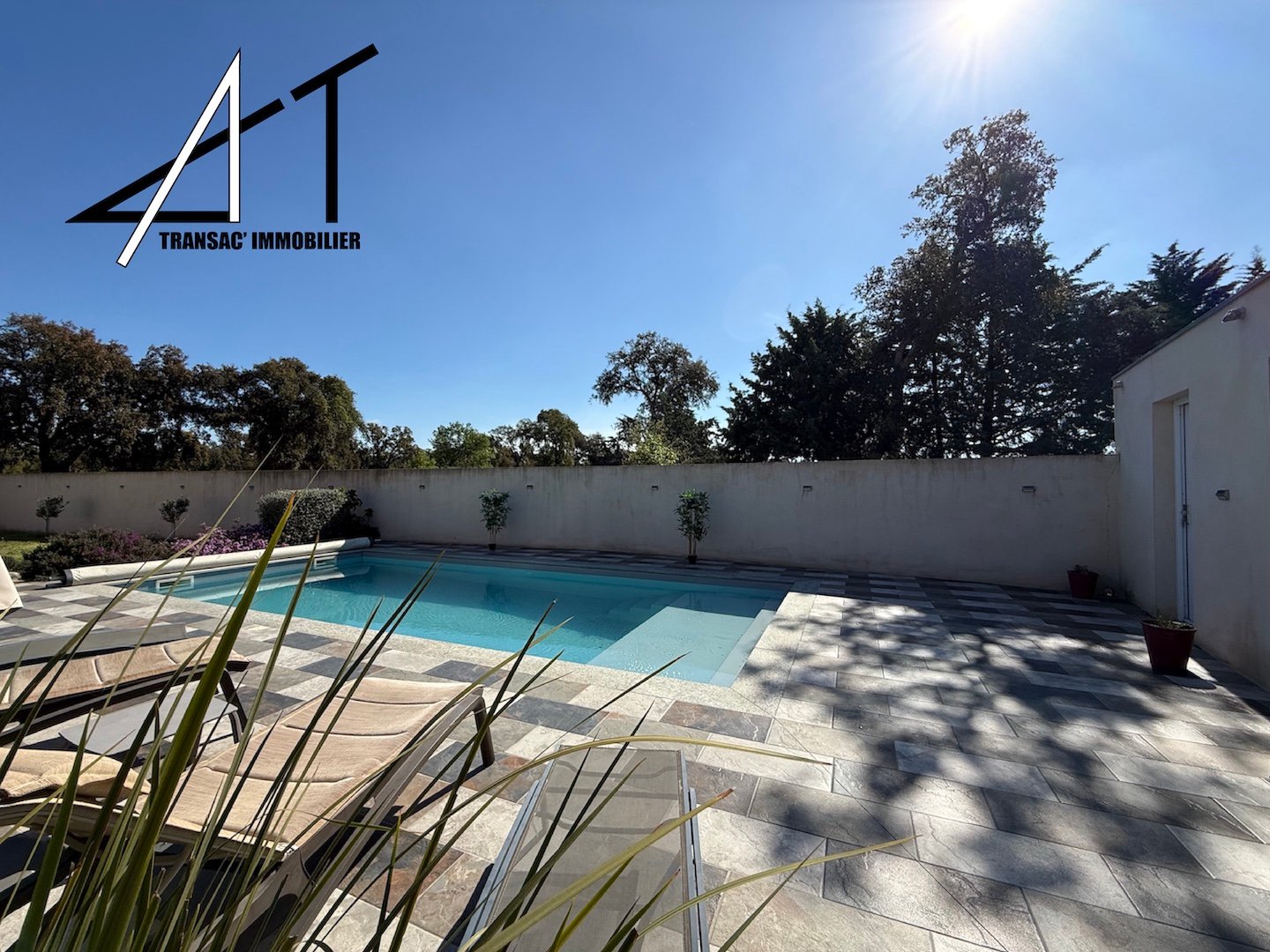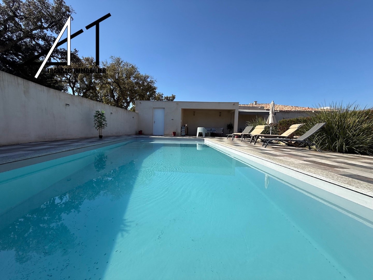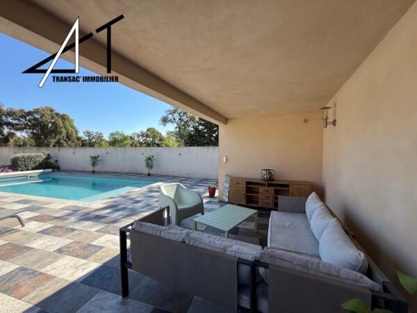 A l’extérieur : piscine invitante + pool‑house (espace détente/annexes), terrasse couverte pour repas en plein air, terrain clos de murs, portail électrique et jardin arboré pour une ambiance intime et sécurisée.