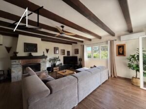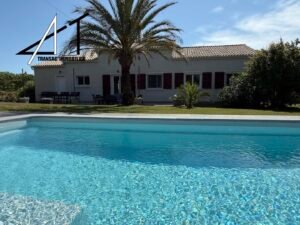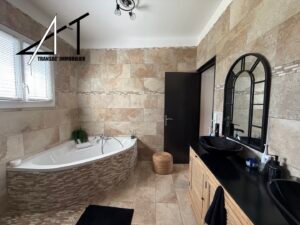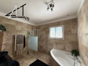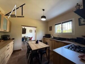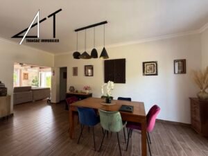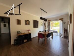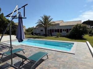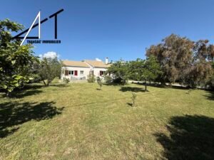 Dans un quartier calme, villa de plain-pied avec piscine composée d’une vaste pièce de vie avec cheminée-insert et climatisation, séjour donnant sur une grande terrasse, cuisine équipée séparée, cellier, 2 wc, 4 chambres, SDB (baignoire et douche). Garage et combles. Piscine sur terrain clos et arboré de 2060 m2.
