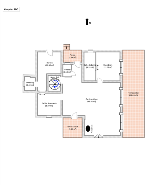 – au rdj : entrée, cuisine équipée ouverte sur belle pièce de vie, 1 chambre parentale avec sdb et wc, 1 bureau, wc indépendant, Une