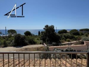 A l’étage : Cuisine équipée sur grande pièce de vie et sa terrasse couverte en vue mer, 2 chambres, salle d’eau avec wc.