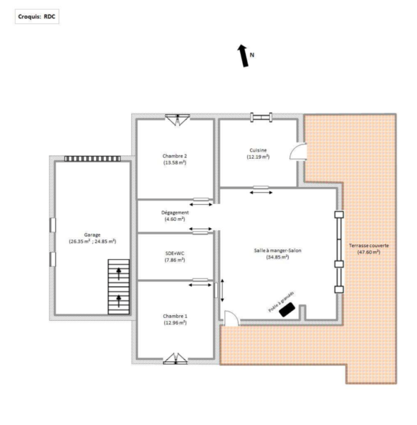 au rdc : cuisine équipée fermée, belle pièce de vie avec sa grande terrasse couverte en vue mer, 2 chambres, salle d’eau avec wc.